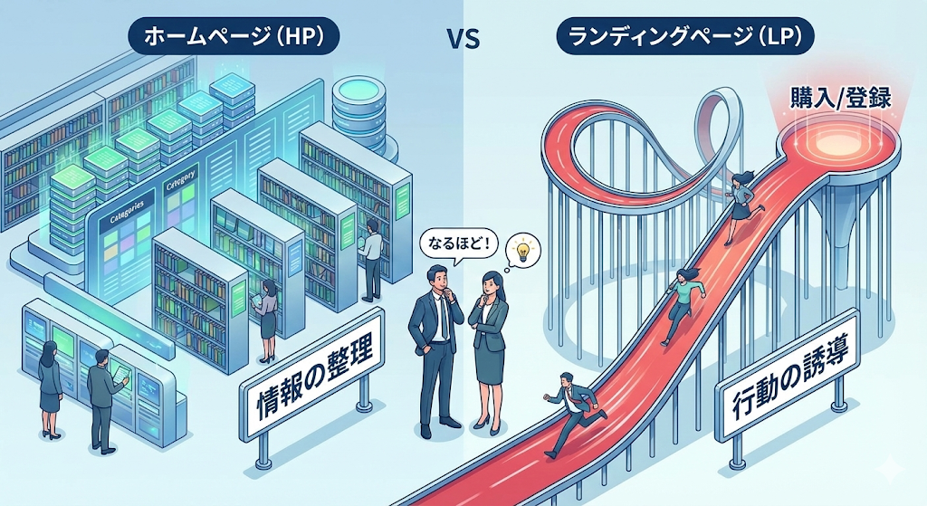 まずは結論から申し上げます。 HP(ホームページ)とLP(ランディングページ)の違いは、「情報の整理」か「行動の誘導」か、という目的の違いにあります。