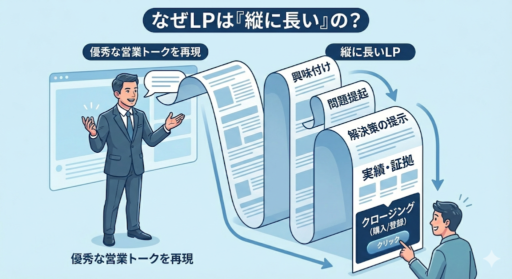 LPが長い理由は、優秀な営業マンのセールストークをそのままWebページ上で再現しているからです。