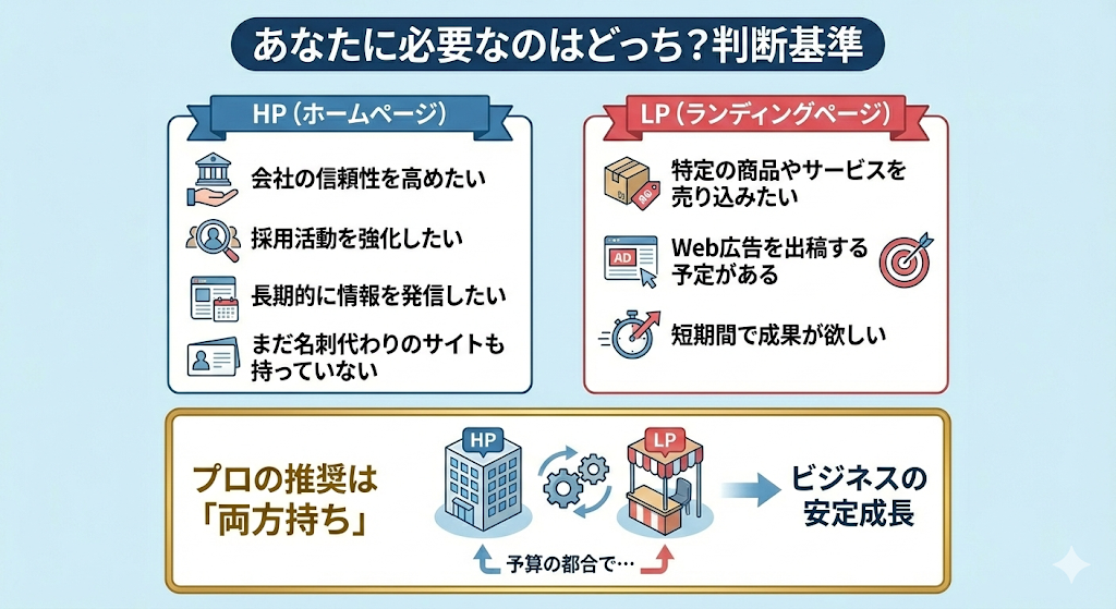 予算の都合でどちらか一つから始める場合は、まずは「名刺代わりのHP」を作り、次に「攻めのLP」を作るという順番が一般的ですが、業種によっては逆のパターン(まずLPで売上を作ってからHPを整える)が有効な場合もあります。