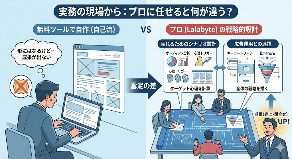 「LPなら、自分で文章を書いて無料ツールで作れそうだな」 そう思われる方もいるかもしれません。確かにツールを使えば形にはなりますが、プロが作るLPとは「成果」に雲泥の差が出ます。