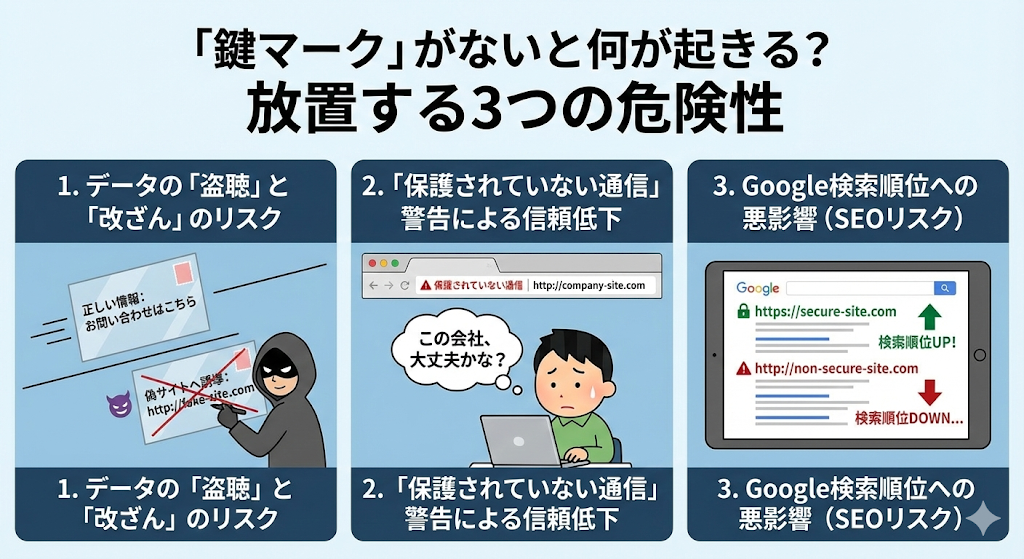 そうおっしゃる経営者の方もいますが、実はその考え方は少し危険です。SSL化していないサイトを放置することには、情報の流出以外にも大きなリスクがあります。