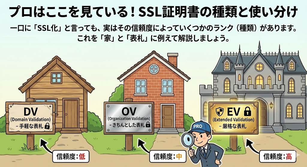 一口に「SSL化」と言っても、実はその信頼度によっていくつかのランク(種類)があります。これを「家」と「表札」に例えて解説しましょう。