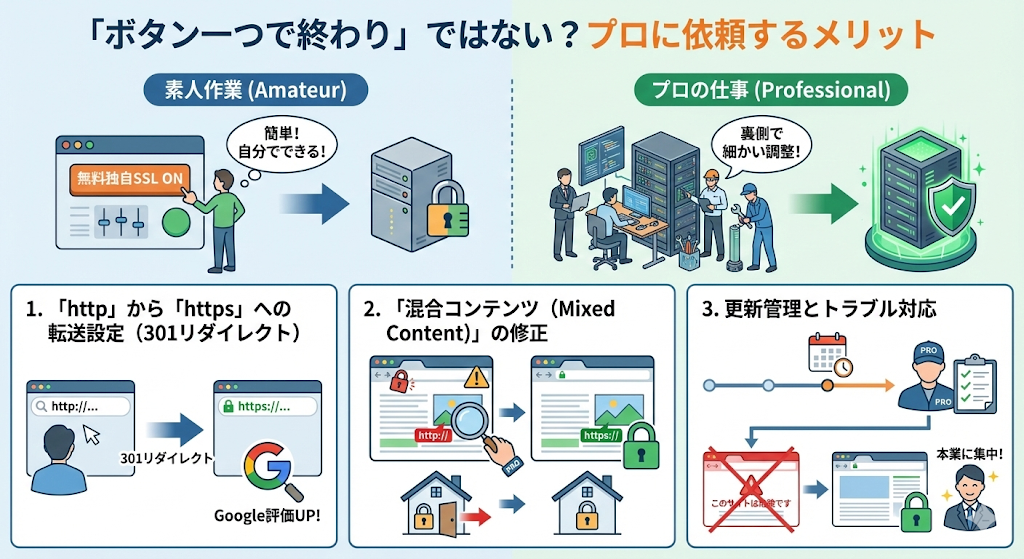 しかし、Web制作のプロがSSL化を行う際、単に「設定をONにする」だけでなく、裏側で非常に細かい調整を行っています。ここが、素人作業とプロの仕事の大きな違いです。