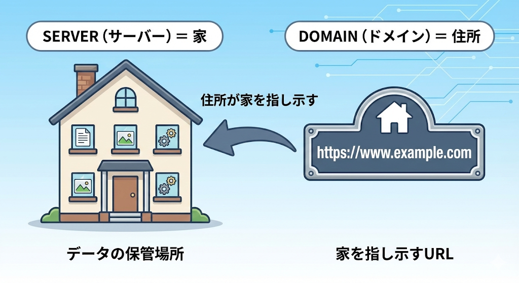 (ここに「家=サーバー/住所=ドメイン」のシンプルな図解を入れるとわかりやすい)
